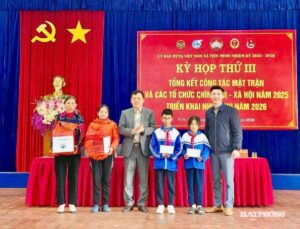 Đại diện TYM chi nhánh Hải Phòng trao quà Tết tặng hộ nghèo, cận nghèo trong chương trình “Ấm áp cùng TYM”, trao học bổng cho con em khách hàng đạt học sinh giỏi trong chương trình “Chắp cánh ước mơ” tại xã Tiên Minh.