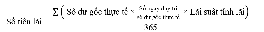Số tiền lãi ngày bằng (=) Số dư gốc thực tế nhân (x) lãi suất tính theo năm chia (/) 365